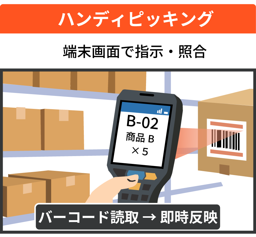 ハンディピッキングは、携帯端末を用いて作業指示を確認しながら進める方式です。作業者は端末画面に表示された指示に従い、対象商品のバーコードを読み取りながら作業を行います。読み取り結果はリアルタイムでシステムに反映されます。